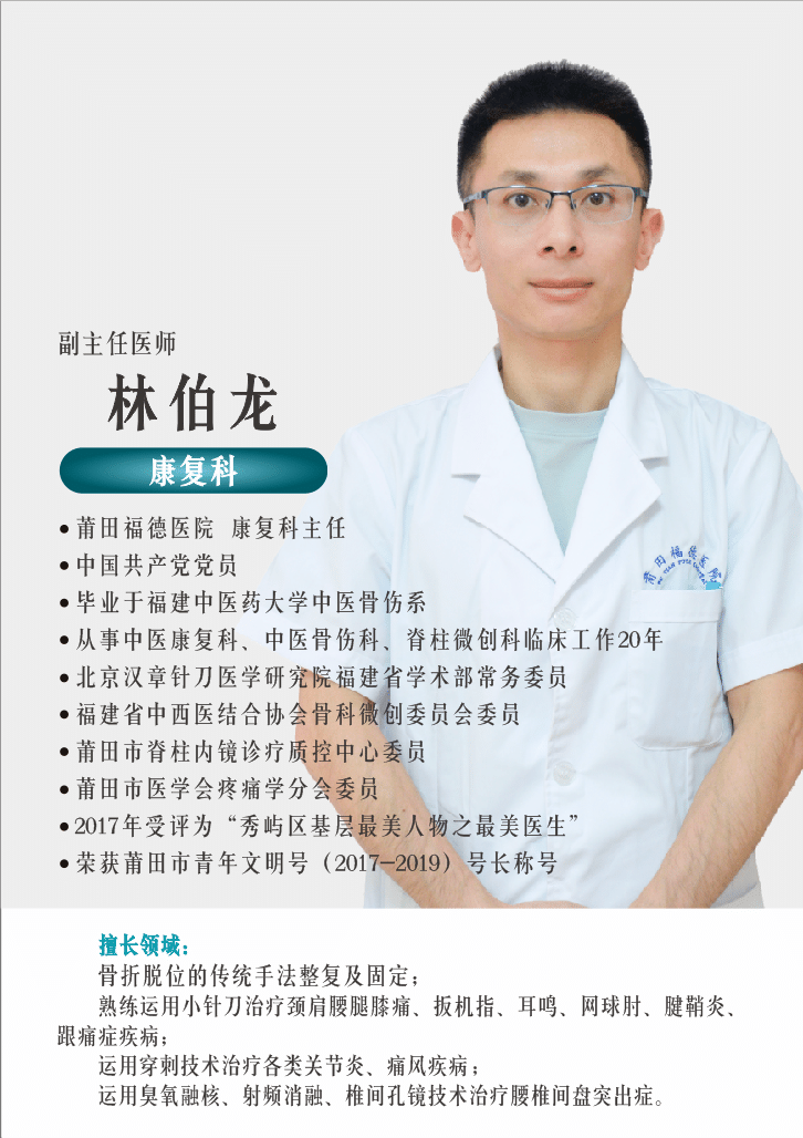 擅长领域: 治疗中风后遗症、面瘫、神经痛等神经系统疾病,各种痛症、扭伤、急性软组织损伤、慢性劳损等运动系统疾病,各种常见病、慢性病及疑难杂症的康复治疗。