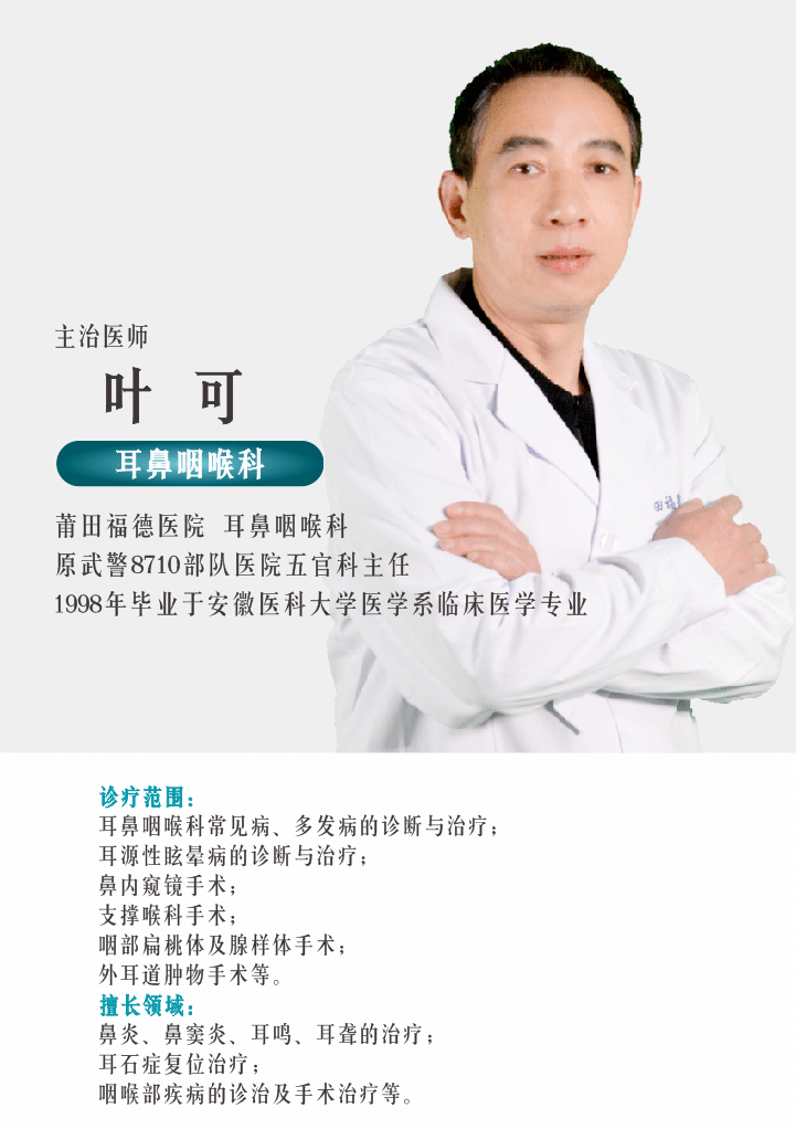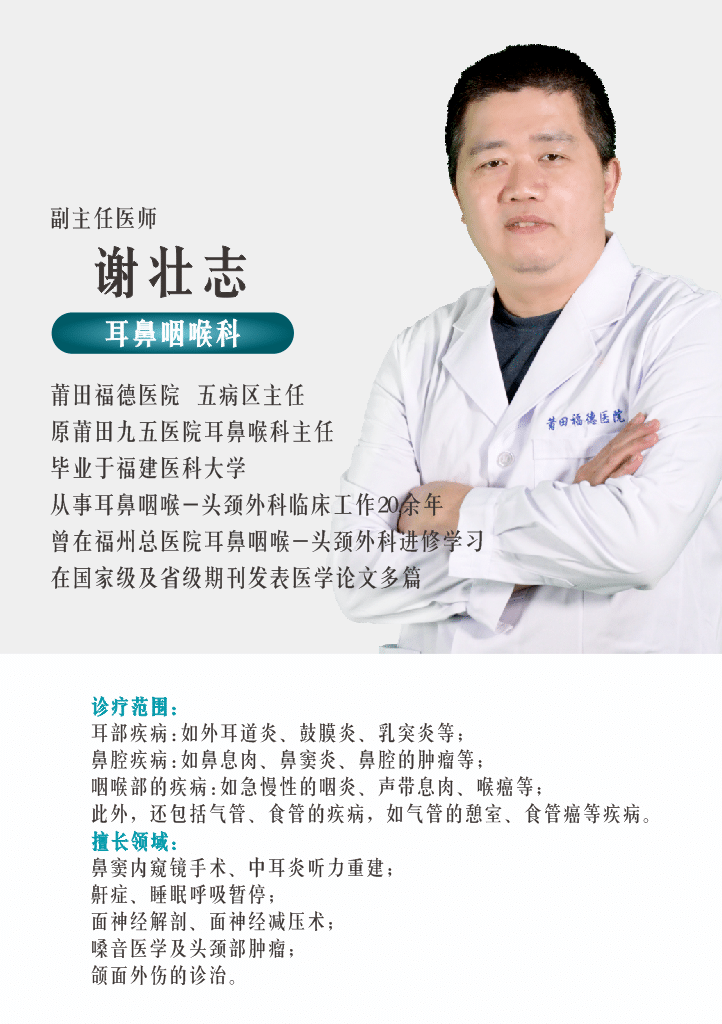 耳鼻咽喉科由莆田福德医院大五官科主任谢壮志领衔坐诊,汇聚专业医疗力量,在腺样体、扁桃体肿大、颌面外伤、耳石症、各类鼻炎及中耳炎等常见及疑难疾病的诊治上,形成了独具特色的技术优势,致力于为患者提供安全、精准、高效的诊疗服务。